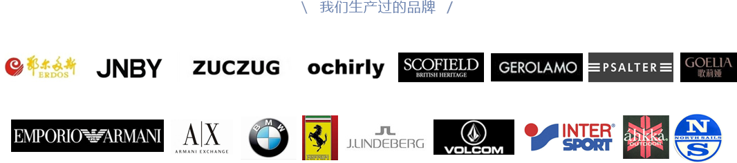 新元服裝擁有一支有著豐富經驗和忠于職守的專業團隊,以誠信為本,嚴謹務實,重視質量和交期,與國內外的多家客戶建立了長期良好的合作關系,公司的服務的國內外品牌包括:
